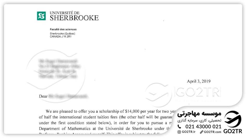 نامه پذیرش و بورسیه دانشگاه شربروک کانادا