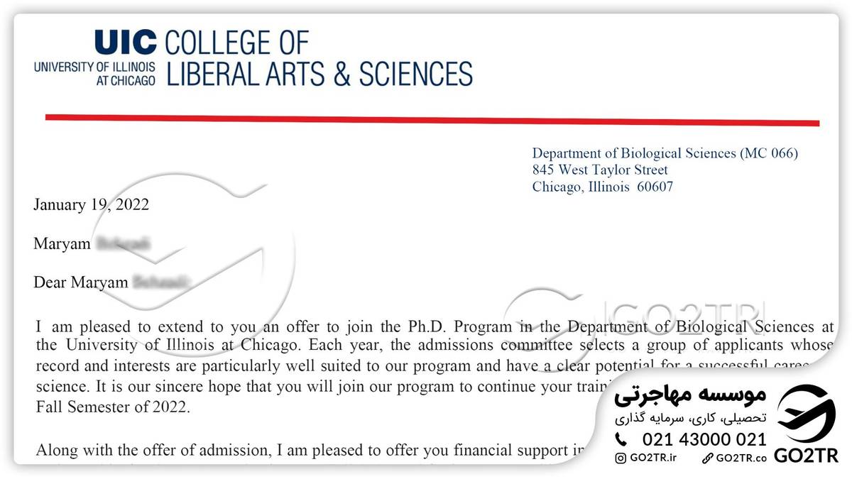نامه پذیرش از دانشگاه ایلینوی شیکاگو آمریکا