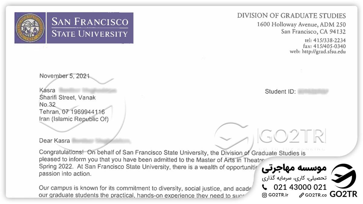 نامه پذیرش دانشگاه ایالتی سان فرانسیسکو آمریکا