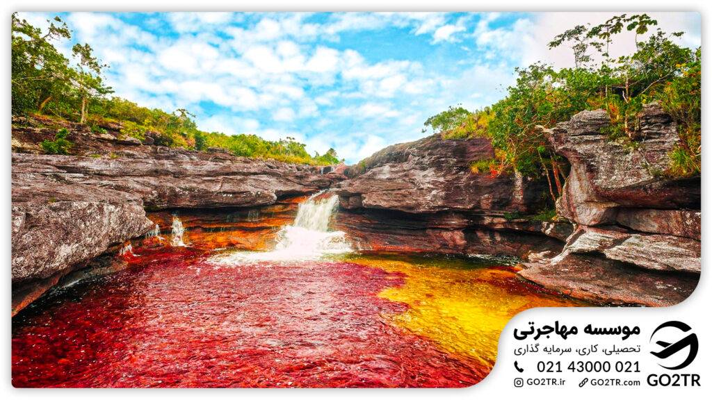 - Cano Cristales: کانو کریستیل یکی از دیدنیهای بسیار جذاب در کشور کلمبیا است. این محل دارای رودخانههای پنج رنگ و یا رنگین کمانی است. یکی از جاذبههای دیدنی و جذاب محسوب میشود. به طور کلی فضای زیست محیطی در این کشور در راستای گردشگری ارزیابی میشود. بهداشت در این منطقه بسیار رعایت شده است و گیاهان و سنگها و شن و جلبک به صورت حرفهای کنار هم قرار گرفتهاند و رنگآمیزی بسیار زیبایی را فراهم ساخته است. موقعیت مکانی رنگ آب و همینطور عناصری که داخل آن دیده میشود به رنگهای زرد و قرمز است.