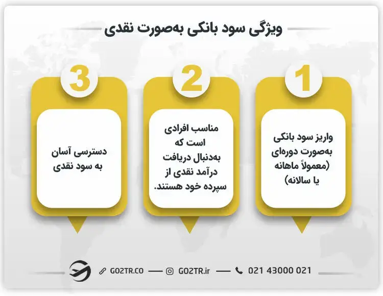 - این نوع سود مناسب افرادی است که بهدنبال دریافت درآمد نقدی از سپرده خود هستند تا بتوانند از سود سپرده خود بهطور مستقیم استفاده کنند.