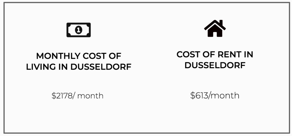 دوسلدورف هفتمین شهر پرجمعیت و پایتخت مد و فشن آلمان بهحساب میآید. این شهر جذاب و رویایی به نام شهر کافهها نیز شناخته میشود. علاوه بر این، محل تجمیع آژانسهای تبلیغاتی و دومین مرکز بانکی آلمان پس از شهر فرانکفورت محسوب میشود. هزینههای زندگی، خوراک و اجازه در این شهر گران است. این شهر از لحاظ کیفیت زندگی و سطح کلی زیرساخت در رتبه ۶ام جهان قرار گرفته است. شاخص قدرت خرید مردم، امنیت، مراقبتهای درمانی، در این شهر بسیار بالا است، همچنین شاخص آلودگی هوا نیز پایین است. به طور کلی این شهر، از لحاظ آب و هوا، تجارت، موقعیت کاری، درآمد و تعداد حضور ایرانیان، میتواند یکی از بهترین شهرهای برای زندگی ایرانیان باشد.
