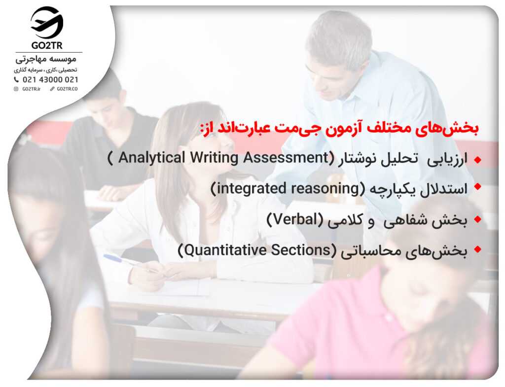 آزمون GMAT از چهار بخش تشکیل میشود که متقاضی باید پاسخگوی هر چهار بخش آزمون باشد. این بخشها عبارتاند از: