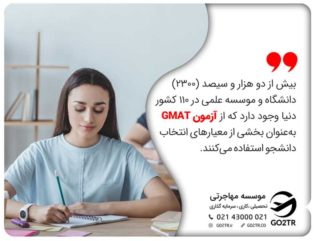 جهت پذیرش در دانشگاههای معتبر دنیا مثل: دانشگاههای کانادا، آمریکا و… داشتن مدرک GMAT ضروری است. نمرات این آزمون بین دویست تا هشت صد میباشد؛ که برای پذیرش در دانشگاههای تراز اول دنیا باید نمرهی بالاتر از هفتصد دریافت کرد.