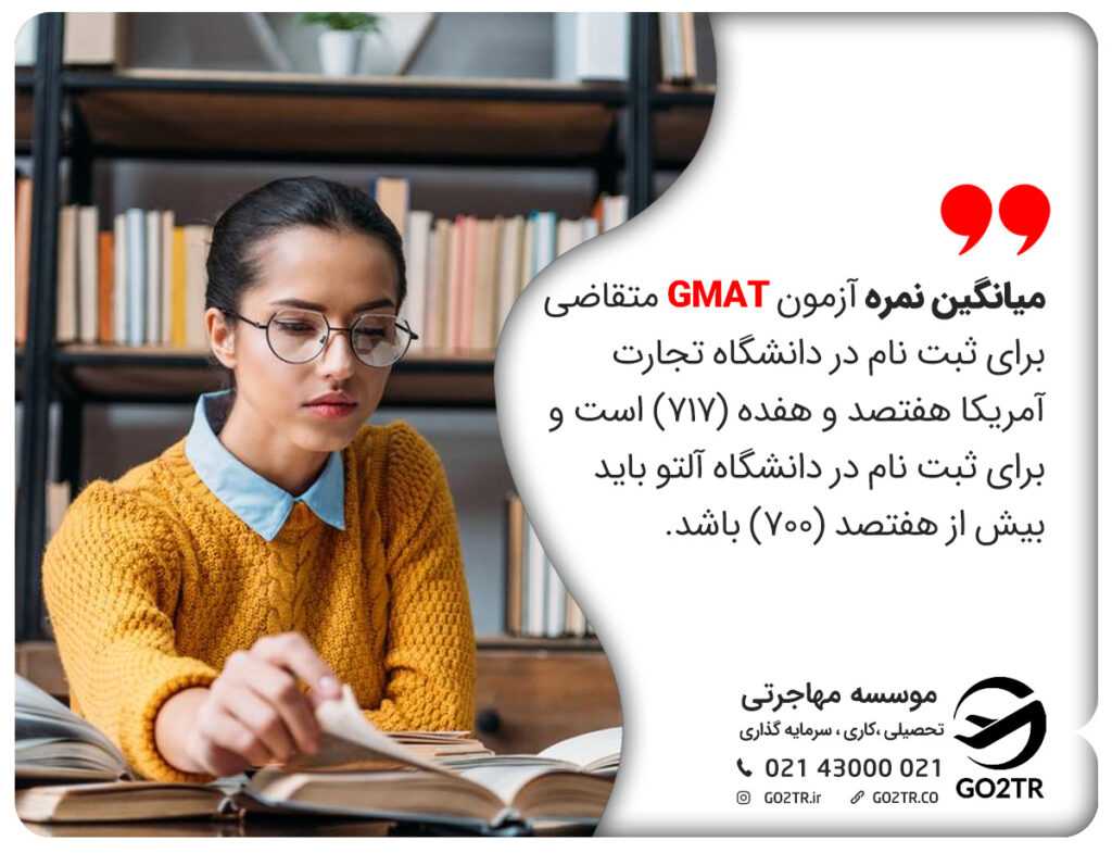 میانگین نمره ی آزمون GMAT متقاضی برای ثبت نام در دانشگاه آلتو باید بیش از هفتصد (۷۰۰) باشد.