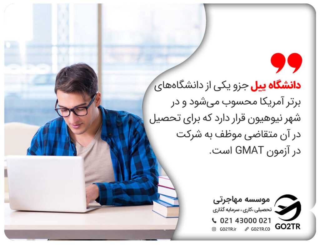 دانشگاه ییل جزو یکی از دانشگاههای برتر آمریکا محسوب میشود و در شهر نیوهیون قرار دارد. نیوهیون شهری در ایالات نیوانگلند آمریکا است. این دانشگاه قدمت بسیار بالایی دارد. افراد مشهوری در دنیا همچون؛ بیل کلینتون، جان کری، جورج بوش و… در آن تحصیل کرده اند. یکی از دانشکدههای معروف این دانشگاه، دانشکدهی کسب و کار و تجارت است؛ که هدف خود را «آموزش رهبران مشاغل و کسب و کار» اعلام کرده است. متقاضیان پذیرفته شدن در این دانشگاه علاوه برتهیهی سایرمدارک باید نمره ی مناسب در آزمون جی مت را کسب کنند.