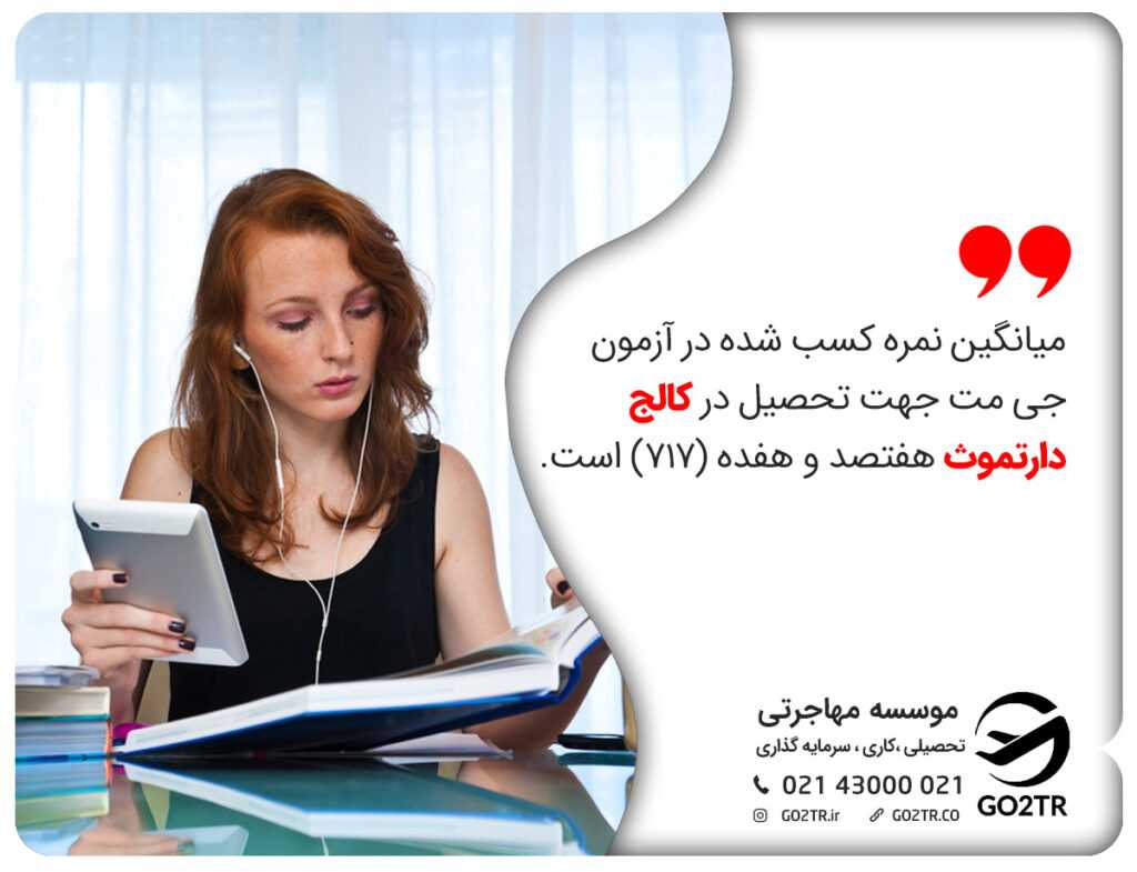 میانگین نمره کسب شده در آزمون جی مت جهت تحصیل در کالج دارتموث هفتصد و هفده(۷۱۷) است.