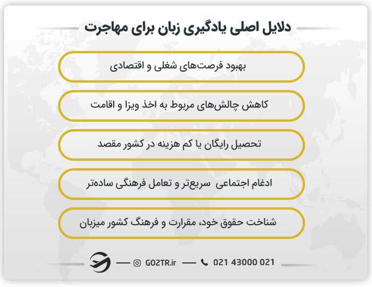 در حقیقت یادگیری زبان کشور مقصد و یا یک زبان دوم مثل انگلیسی هنگام مهاجرت یک جزء جدایی ناپذیر از این پروسه است حتی اگر یادگیری زبان را برای مدتی به تعویق بیاندازید باز هم در ادامه مسیر ملزم به یادگیری آن هستید و نمیتوانید یادگیری آن را به طور کلی از پروسه مهاجرت حذف کنید. دلایل اصلی یادگیری زبان برای اینکه مهاجرت موفقتری داشته باشید به شرح زیر است.