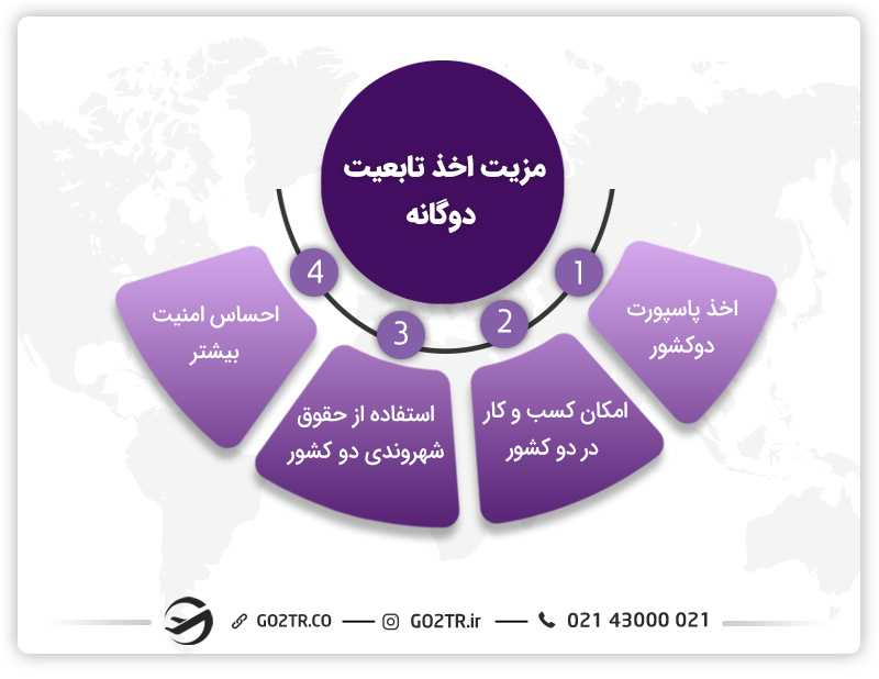 اخذ تابعیت دوگانه در شرایط ناپایدار کنونی جهان میتواند، امنیت روانی بسیاری برای افراد فراهم کند. چرا که با بهم ریختن اوضاع سیاسی، اقتصادی و اجتماعی یک کشور افرادی که تابعیت دوگانه دارند؛ میتوانند، به دیگر کشور مهاجرت کنند و از شرایط مناسب کشور دوم بهرهمند شوند.