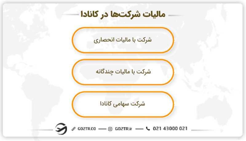 افرادی که دارای حرفه و یا شغل خاصی هستند؛ میتوانند شرکت با مالکیت انحصاری(Sole-proprietorship) ثبت کنند. همچنین افرادی که دارای کار قراردادی نیستند و یا برای انجام دادن کارهای خود نیازی به امور اداری یا دفتری ندارند. این نوع شرکتها را برای خود ثبت میکنند. مالیت پرداختی این نوع شرکتها از نوع مالیات بر درآمد شخصی است. در شرکت با مالکیت چندگانه(Partnership) مالیات را به صورت مشارکتی پرداخت میکنند؛ اما پرداخت مالیات در شرکت سهامی (Co-operatives) به صورت مستقل است. اغلب شرکتهای بزرگ کانادا از این نوع هستند. همچنین هزینه ثبت، نگهداری و مالیات این نوع شرکتها نسبت به سایر شرکتها بیشتر است.