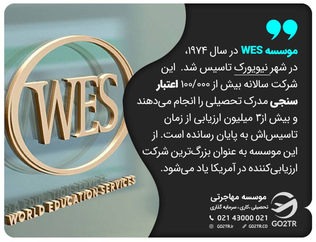 موسسه WES، مخفف (World Education Services)، یک سازمان غیرانتفاعی و بینالمللی است که با هدف کمک به دانشجویان سراسر جهان و مهاجران برای دستیابی به اهداف آموزشی و شغلی خود در ایالات متحده و کانادا فعالیت میکند. ارزیابیهای این موسسه به طور گسترده در بیش از ۲۵۰۰ موسسه آموزشی، تجاری و دولتی در سراسر آمریکا و کانادا به رسمیت شناخته میشود.