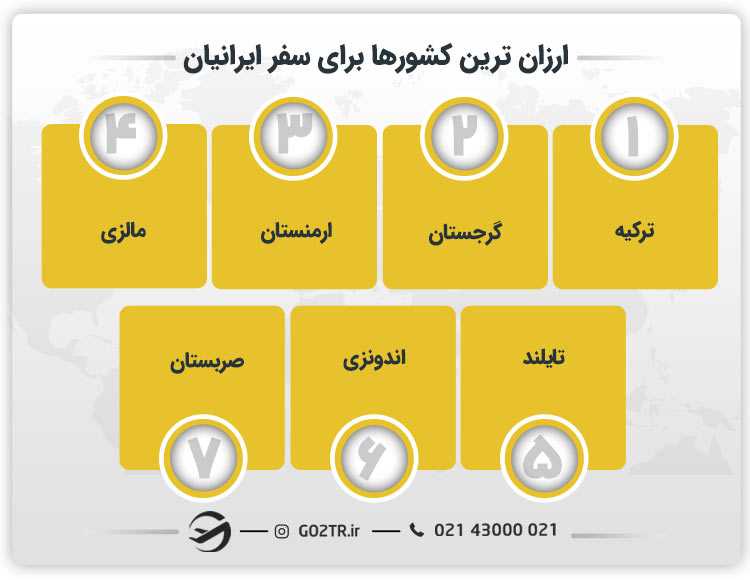 هترین کشورها برای سفر ارزان ایرانیان معمولاً ترکیه، گرجستان، ارمنستان، مالزی، اندونزی و صربستان هستند به دلیل هزینه پایین پرواز، اقامت و خورد و خوراک و سهولت دریافت ویزا.