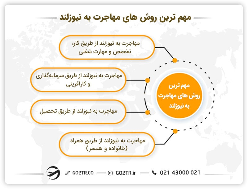 کار، تحصیل، سرمایهگذاری و ازدواج با شهروند یا مقیم نیوزلند اصلیترین راه های مهاجرت به نیوزلند هستند.