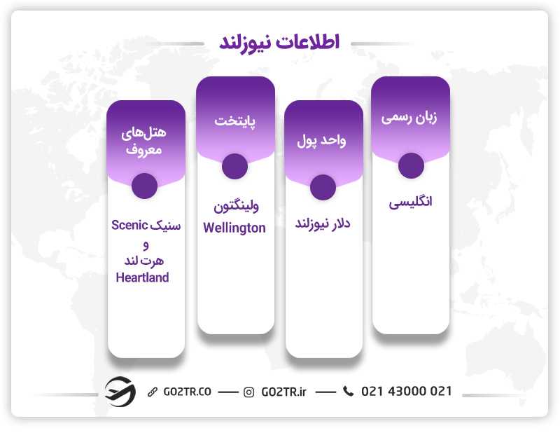 کشور نیوزلند سالانه پذیرای توریستهای بسیاری است. شهرهای اوکلند و ولینگتون شهرهای بزرگ و توریستی این کشور هستند. پرواز مستقیم از تهران به نیوزلند برقرار است و طول ساعت پرواز ۲۳ ساعت است. در حال حاضر یک دلار امریکا ۱٫۶۱ دلار نیوزلند است. در فرودگاه بیش از ده هزار دلار نیوزیلند NZ داشتید، لازم است فرم گزارش مرزی موجودی نقدی را تکمیل کنید.