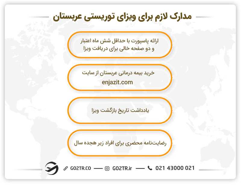 ویزای توریستی کشور عربستان از طریق سازمان حجوزیارت صادر میشود و در قالب ویزای مذهبی است. شما برای اخذ ویزای توریستی این کشور باید یک سری مدارک مهم داشته باشید، هر شخص باید پاسپورت معتبر با اعتبار حداقل ۶ ماهه داشته باشد و دو قطعه عکس رنگی با حجاب اسلامی ارائه دهد. ارائه گواهی تمکن مالی نیز الزامی است. ویزای توریستی این کشور هر یک به شکلی است که شخص می تواند از آن استفاده کند و یک ماه در کشور عربستان سکونت داشته باشد. ویزای توریستی اعتبار ۹۰ روزه دارد. البته که ایرانیان بارها برای سفر به کشور عربستان محدود شدهاند.