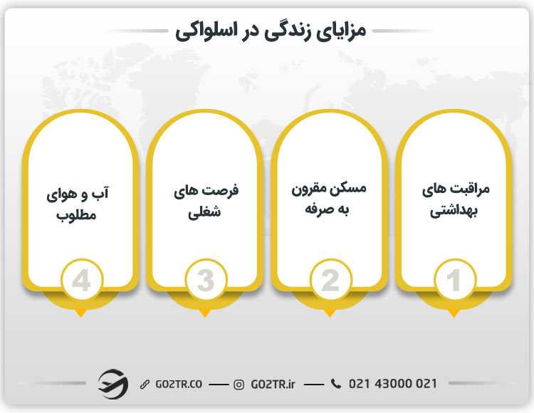 ما در این مقاله از موسسه مهاجرتی GO2TR سعی کردهایم اطلاعات مفیدی در ارتباط با شرایط زندگی، کار، فرهنگ، هزینه زندگی و … در اسلواکی را در اختیار افرادی که قصد زندگی در اسلواکی را دارند، قرار دهیم. در ضمن شما میتوانید با تماس با موسسه GO2TR ضمن استفاده از مشاوره تلفنی رایگان، از تجربه و تخصص کارشناسان ماهر این موسسه در تمامی مراحل مهاجرت خود بهره ببرید.