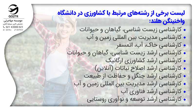 دانشگاه و مرکز پژوهشی واخنینگن در کشور هلند واقع شده است و یکی از بهترین دانشگاههای جهان در حوزه کشاورزی است. بر اساس رتبه بندی QS در سال ۲۰۱۹ دانشگاه واخنینگن هلند، برترین دانشگاه کشاورزی و جنگلداری در جهان معرفی شد. این دانشگاه یکی از دانشگاههای معتبر هلند بهحساب میآید که بر روی موضوع “غذای سالم و محیط زندگی” به عنوان یک ایده و اصل تمرکز دارد. همچنین در ایجاد و ترویج این مفهوم در نهادهای تجاری و سازمانهای دولتی همکاری میکند. رویکرد اصلی دانشگاه واخنینگن انجام پژوهش و تحقیقات علمی، توسعه مهارت و درک دانشجویان در زمینه کشاورزی است. این دانشگاه دارای ۶ برنامه کارشناسی، ۳۰ برنامه کارشناسیارشد و دکتری است. دانشگاه واخنینگن دارای چندین دوره آموزشی آنلاین نیز است. در این دانشگاه رشته مهندسی کشاورزی ارائه نمیشود اما برخی از رشتههای مرتبط با کشاورزی در دانشگاه واخنینگن هلند ارائه میشوند. این رشتهها عبارتند از: