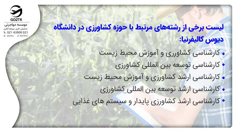 این دانشگاه در ارائه با کیفیتترین برنامههای آموزشی کشاورزی مقام اول را در آمریکا کسب کرده است. در این دانشگاه ۴ کالج و ۶ مدرسه حرفهای بیش از ۱۰۰ رشته کارشناسی و ۹۶ برنامه کارشناسیارشد را ارائه میدهند. در سال ۲۰۱۷-۲۰۱۸، دانشگاه دیویس ۱۵۹ درخواست ثبت اختراع و ۱۷۷ پرونده اختراع را ثبت کرده است. بر اساس رتبهبندی QS دانشگاه کالیفرنیا دیویس دومین دانشگاه برتر در زمینه کشاورزی و جنگلداری است. دانشگاه دیوس برخی از رشتههای مرتبط با حوزه کشاورزی را برای دانشجویان علاقهمند در مقاطع تحصیلی مختلف ارائه میدهد. این رشتهها عبارتند از: