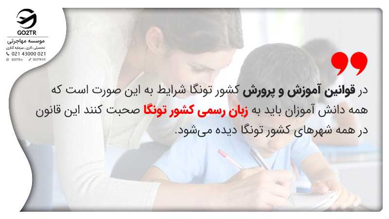 در قوانین آموزش و پرورش کشور تونگا شرایط به این صورت است که همه دانش آموزان باید به زبان رسمی کشور تونگا صحبت کنند این قانون در همه شهرهای کشور تونگا دیده میشود. قوانینی که در زمینه قیمت پاآنگای کشور تونگا ارزیابی شده است وابسته به نرخ نهایی ارزش این کشور است. نرخ پاآنگای کشور تونگا به نسبت گذشته بیشتر شده است. مشخص است که که قوانین مالی و اقتصادی در کشور تونگا بهبود داشته است البته که نظام بانکداری نیز وابسته به قوانین کشور بریتانیا ارزیابی شده است.