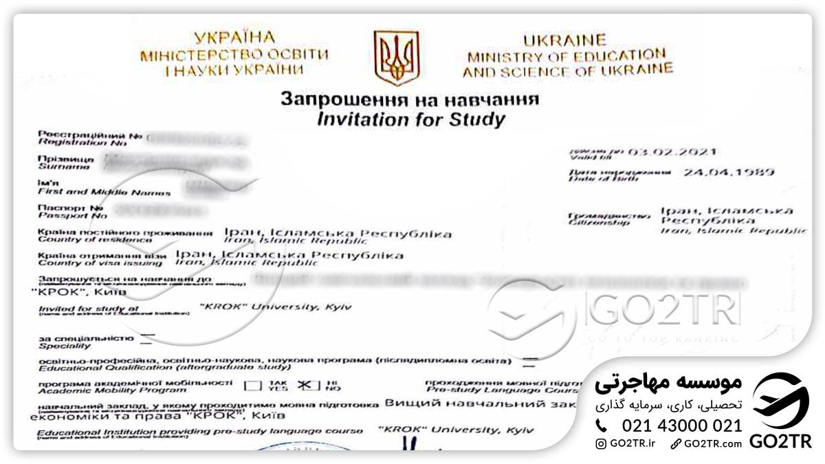 پس از تایید درخواست پذیرش از سوی دانشگاه، با ارائه دعوتنامه تحصیلی و برخی مدارک دیگر که در زیر ذکر شدهاند، به کنسولگری اوکراین در کشور مبدا دانشجو، ویزای تحصیلی برای ورود به خاک اوکراین صادر میشود. در شرایط عادی ویزای اوکراین حداکثر تا ۲۰ روز کاری برای دانشجویان بینالمللی ارسال میشود.