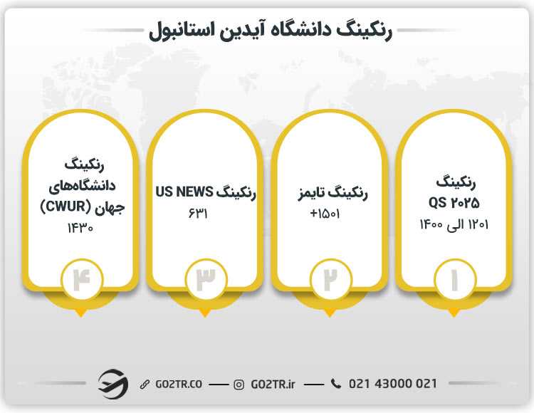 دانشگاه آیدین، یکی از بهترین دانشگاههای جهان محسوب میشود. در جدول زیر میتوانید رنکینگ دانشگاه آیدین استانبول در رنکینگ جهانی QS، رنکینگ جهانی تایمز و رنکینگ بینالمللی US NEWS در سال ۲۰۲۶ مشاهده کنید.