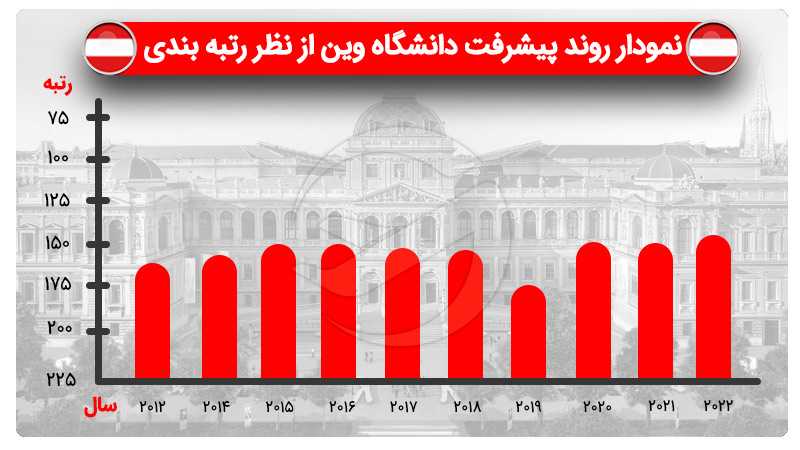 لازم به ذکر است رتبه این دانشگاه در رنکینگ تایمز با یک جهش ۲۷ پلهای، از رتبه ۱۶۴ در سال ۲۰۲۱ به رتبه ۱۳۷ در سال ۲۰۲۲ ارتقاء پیدا کرده است. همچنین رتبه دانشگاه وین در رنکینگ QS از سال ۲۰۱۹ تا ۲۰۲۱ با ۲۵ رتبه بهبود مواجه بوده است. نمودار زیر روند پیشرفت دانشگاه وین از نظر رتبهبندی QS را در بین سالهای ۲۰۱۲ تا ۲۰۲۲ نشان میدهد.